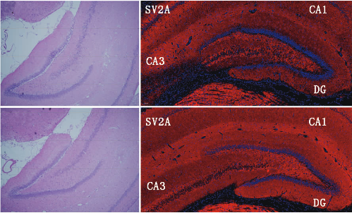 右列:癫痫组(上排)和对照组(下排)右侧海马区域突触囊泡 2A蛋白(SV2A)免疫染色(×100)结果。与对照组相比,癫痫组中SV2A免疫荧光信号(红色)降低,以海马CA3区域降低为著。CA3、CA1为海马的2个区域,DG为齿状回;细胞核DAPI染色荧光信号为蓝色。
