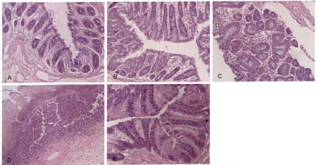 3. 病理学检查:取肠道组织进行HE染色或其他染色方法,观察上皮损伤、炎症细胞浸润、坏死等病理特征。
