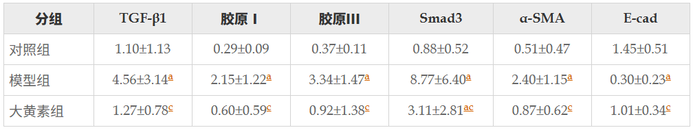 各组大鼠结肠TGF-β1、胶原Ⅰ、胶原Ⅲ、Smad3、α-SMA和E-cad mRNA表达比较 (mean±SD, %).